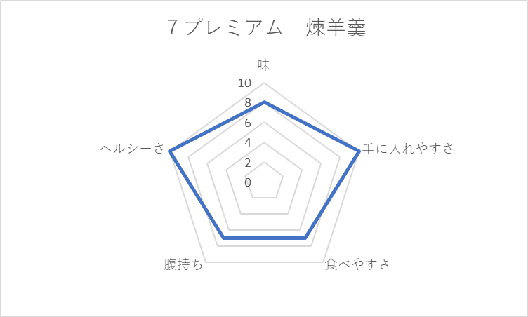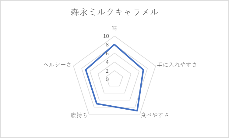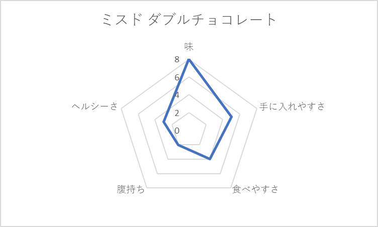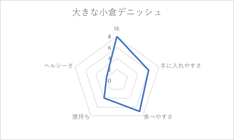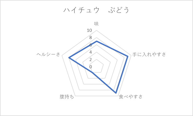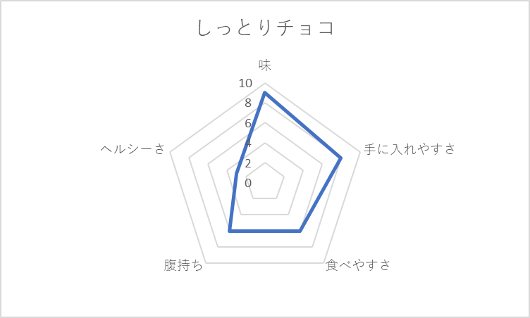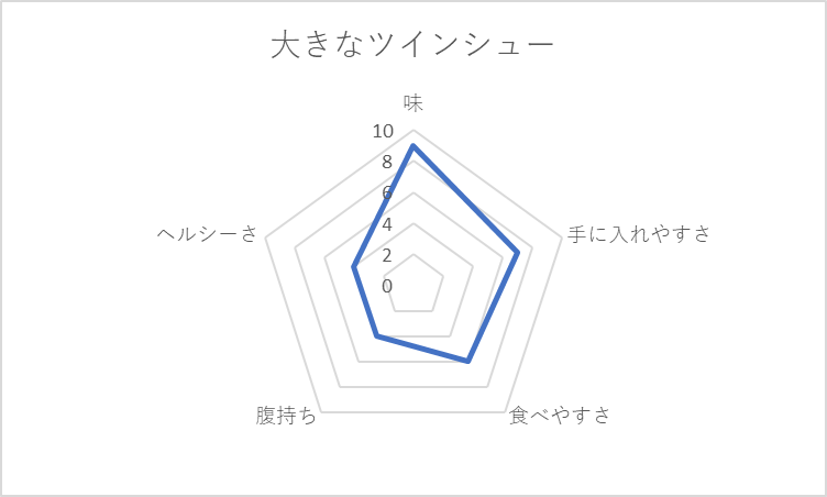 基本、どれも小麦粉を使った炭水化物。菓子パンは、手ごろでつい買ってしまうのだが「腹持ち」「ヘルシーさ」の観点で低評価。菓子パンが太る元と言われるのは、チャートの貧弱な左半身に表れている。