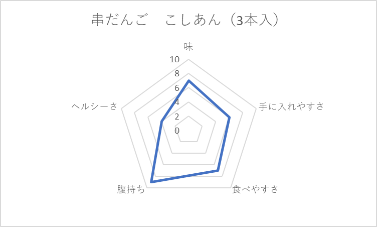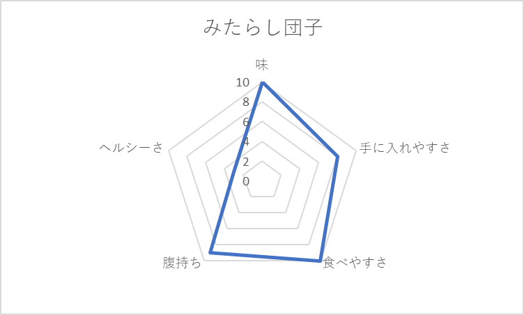 個人的にかなり頻繁に食べる3品。今回の評価基準によると、結構バランスの良い五角形を形成。ただ、ずっと最強の間食だと思い込んでいた「みたらし団子」が、かなりの高カロリーである事実に衝撃を隠せない。「好きなものは体にも良いはず」という都合の良い思い込みが、だらしないボディーの第一歩なのかもしれない。