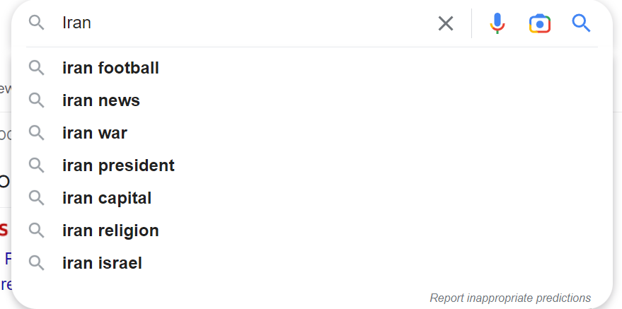 Googleの言語設定を英語に変更して、”Iran”と入れてみると、以下のようなワードが表示される。