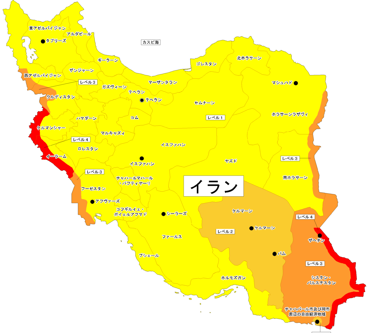 上は、イランの危険度を可視化した図。赤が危険で、黄色が安全なエリア。東のアフガニスタンとパキスタンと隣接する地域と西のイラクと隣接する地域は、危険度マックスレベル4「退避勧告」に指定されている。『アルゴ』の舞台となっている首都テヘランは、危険レベル1の比較的安全な地域。「端っこ以外は、まあ安全」というように、イランの治安状況を抑えておけばよいだろう。