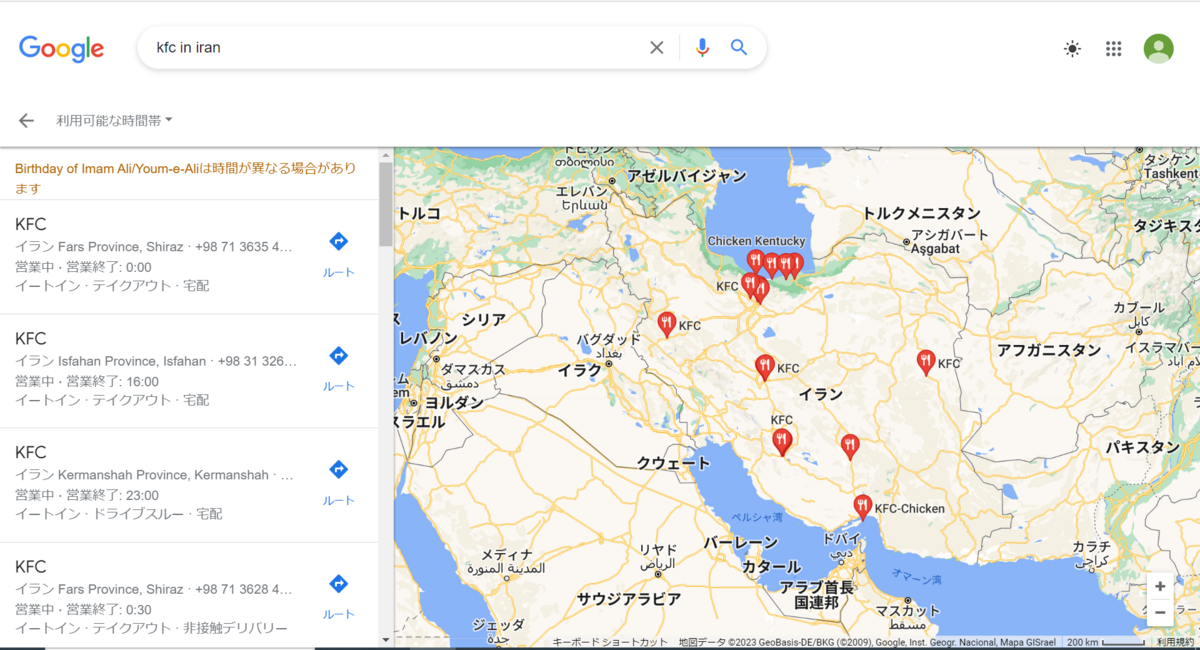 GoogleMapでざっと調べた結果だが、KFCはイラン国内に10以上店舗がある。首都テヘランに多く、日本では危険地域とされているアフガニスタンとの国境付近にも1店舗確認できる。